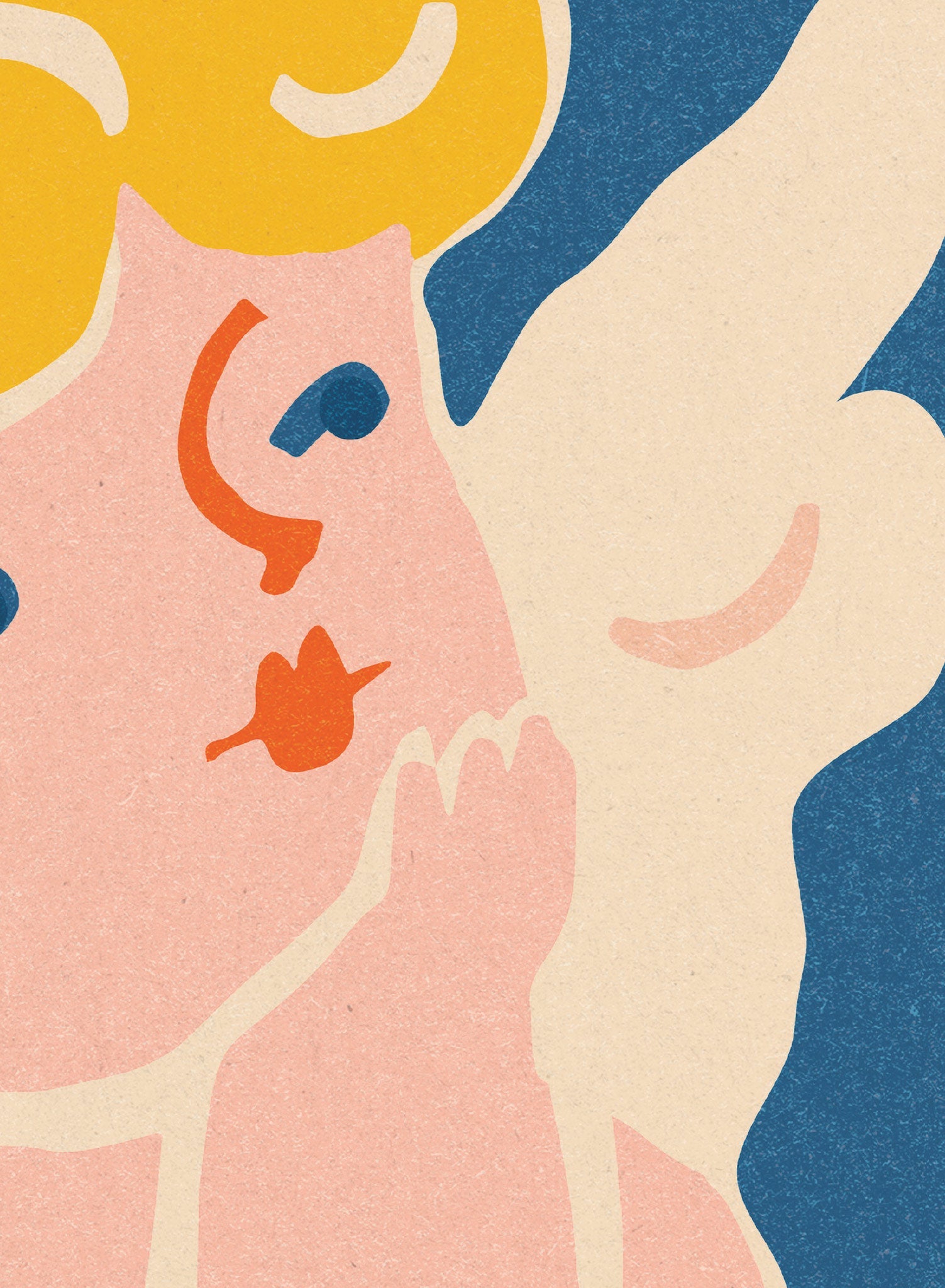 The color palette is a harmonious blend of soft pastels and rich blue, creating a striking contrast that draws the eye. The texture of the print suggests a vintage feel, enhancing its nostalgic appeal. The playful typography complements the whimsical nature of the scene, adding a cheerful note.