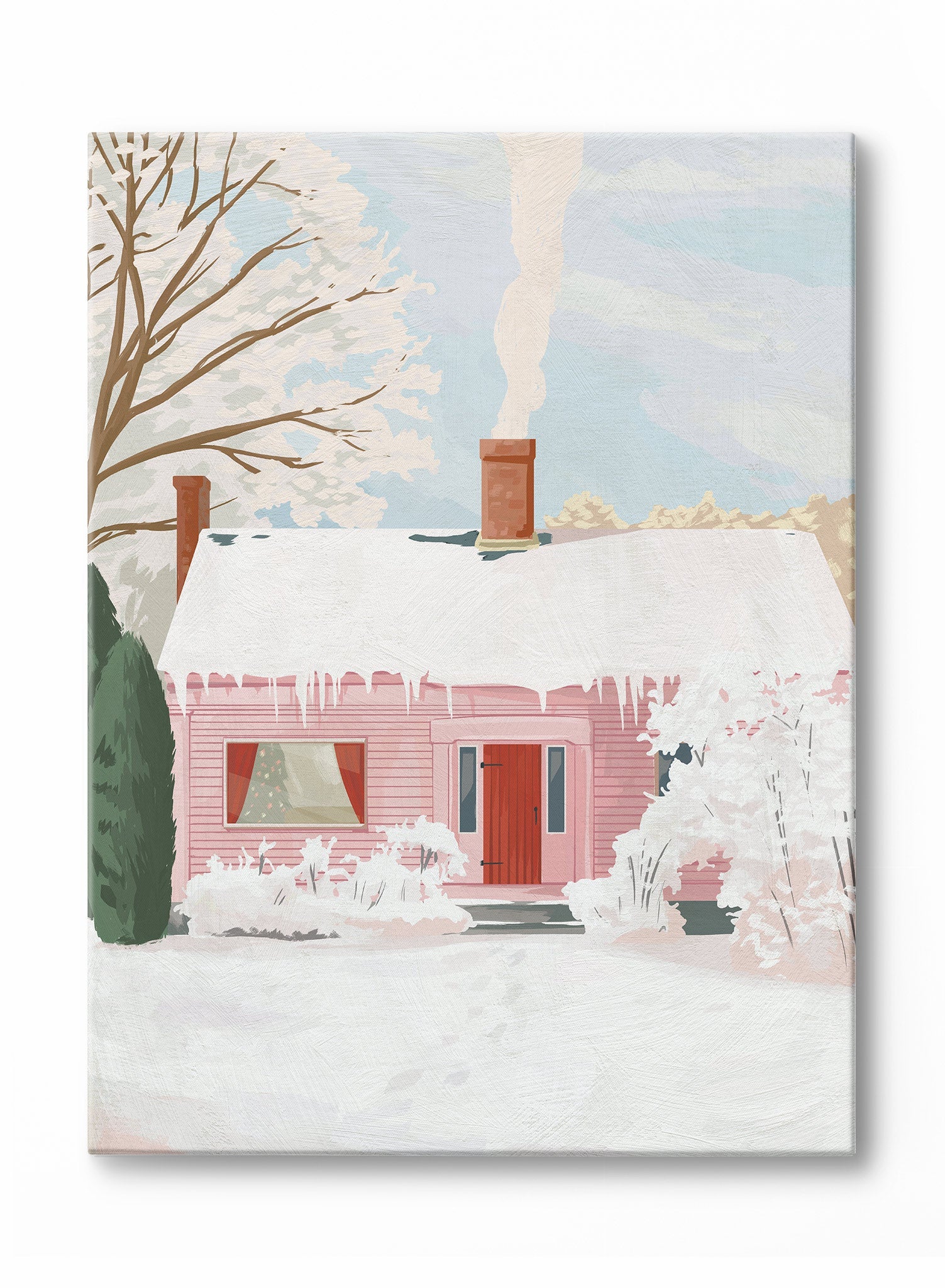 This charming print captures a quaint pink cottage nestled in a serene winter landscape. The house, adorned with icicles, stands amidst snow-laden trees and bushes, exuding a cozy warmth with smoke gently rising from its chimney. The soft pastel sky adds a gentle backdrop, enhancing the peaceful ambiance of the scene.